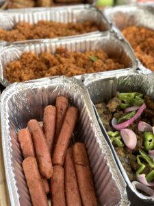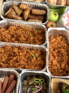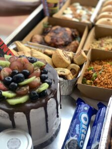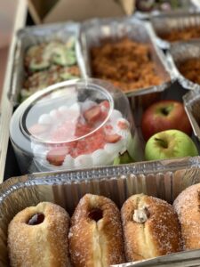 A tray filled with an assortment of freshly made food, pastry treats and desserts. Perfect as a gift or for sharing. Package includes